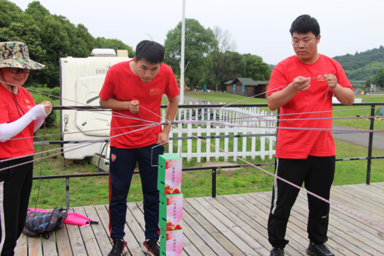 “勝利大會師”環(huán)節(jié),各隊員工每人通過一根細繩協(xié)力控制掛鉤,按照革命歷史事件先后順序逐個將積木搭建成塔,最終勝利會師。同樣值得一提的是,最后一隊在明知落后的情況下,堅決不放棄,在一次次的失敗后最終取得成功,用行動詮釋了何為“堅持到底就是勝利”。