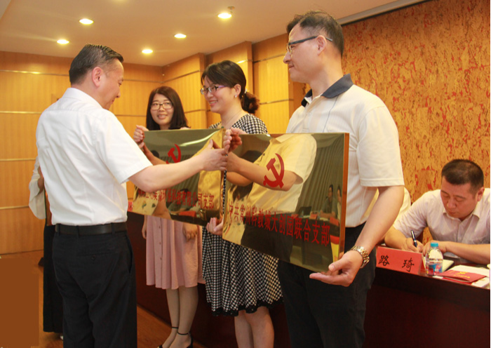 6月26日上午,在建黨96周年華誕即將到來之際,市委常委、宣傳部長、科教城黨工委書記徐光輝為江蘇美淼環保科技有限公司黨支部等三家新成立的黨支部授牌。